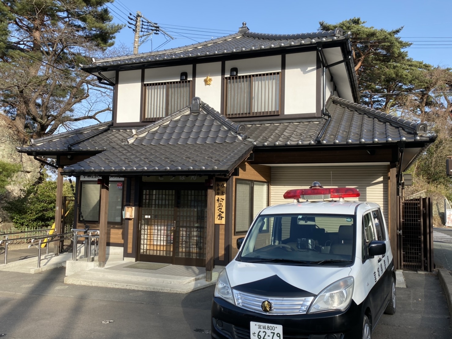 松島交番内外部塗装工事 施工前全景 外壁施工前~洗浄~プライマー~中塗り~上塗り~施工完了 玄関庇差施工前~ケレン~塗装施工完了 換気フード施工前~錆止め~施工完了 天井施工前~養生~施工完了 クロス施工前下地~施工完了 施工完了全景
